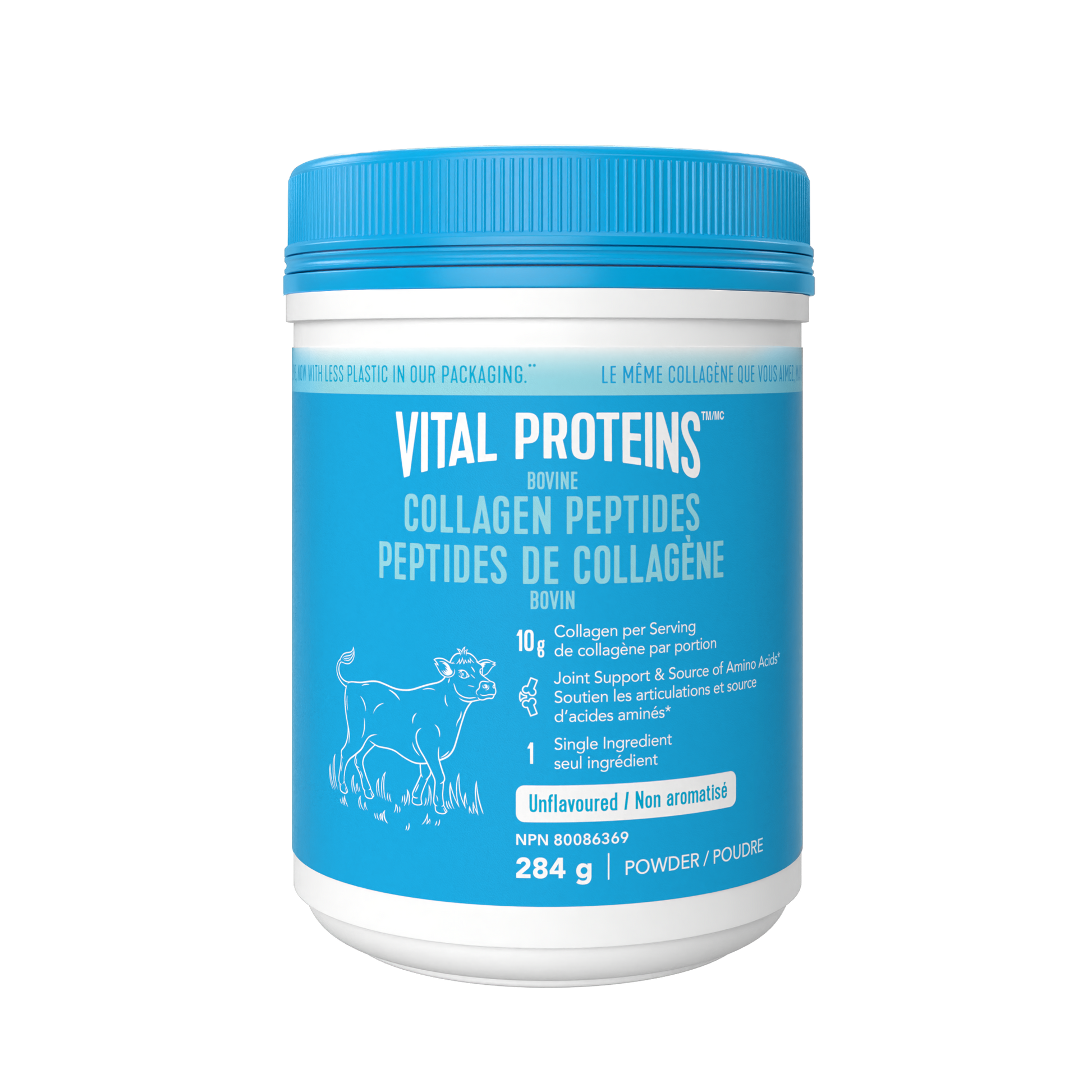 Vital Proteins™ Bovine Collagen is neutral in flavour, and easily soluble in hot or cold liquids. Add 1.5 tablespoons (10g) of Bovine Collagen Peptides to different foods (like desserts or dressings) or beverages (like coffee, smoothies or water) to enhance your wellness routine.